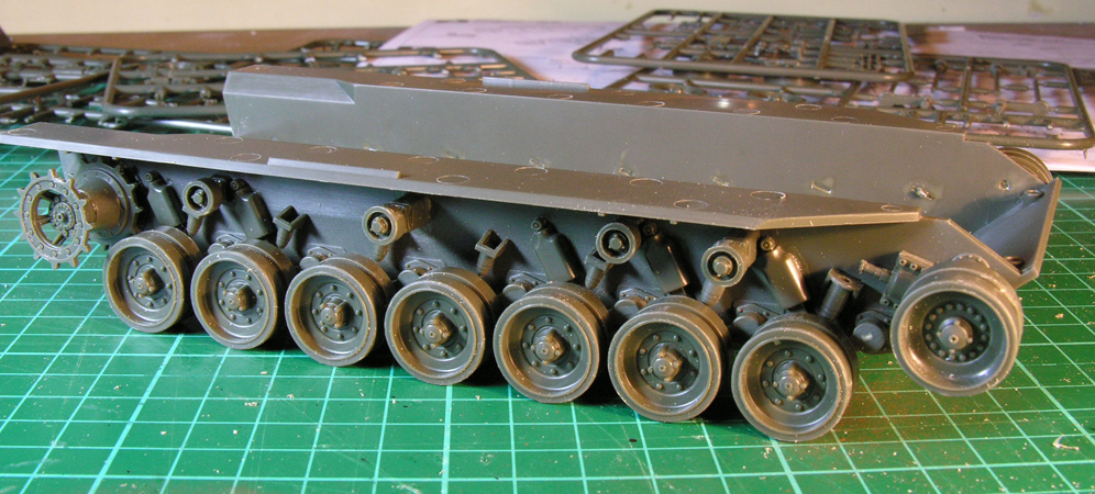 The hull is a conventional tub and top - nice and simple and the fit is excellent. Before fitting the top you might need to think about those torsion bars. If you decide to use the vinyl tracks, the first and last wheels/bars will have to be glued in place because of the tension of the tracks. If you use the separate plastic links, there will be no wheel movement anyway!
