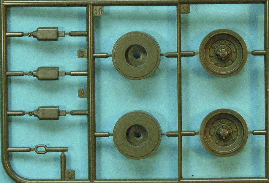 Even worse are the front faces which are just plain wrong (-). Two things are incorrect. The hub is too big and the shape of the inner rim is too right-angled. Wheels are always difficult to describe but the inner rim should be gently angled with a gentle curve towards the ring of retaining nuts. At least the tyres do not have Italeri's trademark lateral grooves in them (+). All will have to be replaced with after-market items from Perfect Scale Modellbau, Mouse House or Italian Kits. At least the tyre width is correct (+) where the Italeri wheels were a little skinny. Even better are the Leopard Workshop options LW001-1 and LW002.